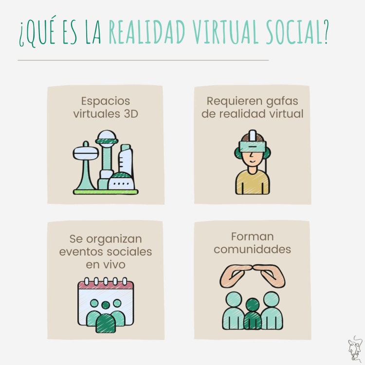 La realidad virtual social está compuesta por espacios virtuales 3D en los que las personas pueden interactuar usando gafas de realidad virtual. AltspaceVR es una de las plataformas de realidad virtual social más conocida, que facilita la organización de eventos virtuales en vivo, creando una comunidad y fomentando las relaciones entre artistas y empresas con intereses compartidos.