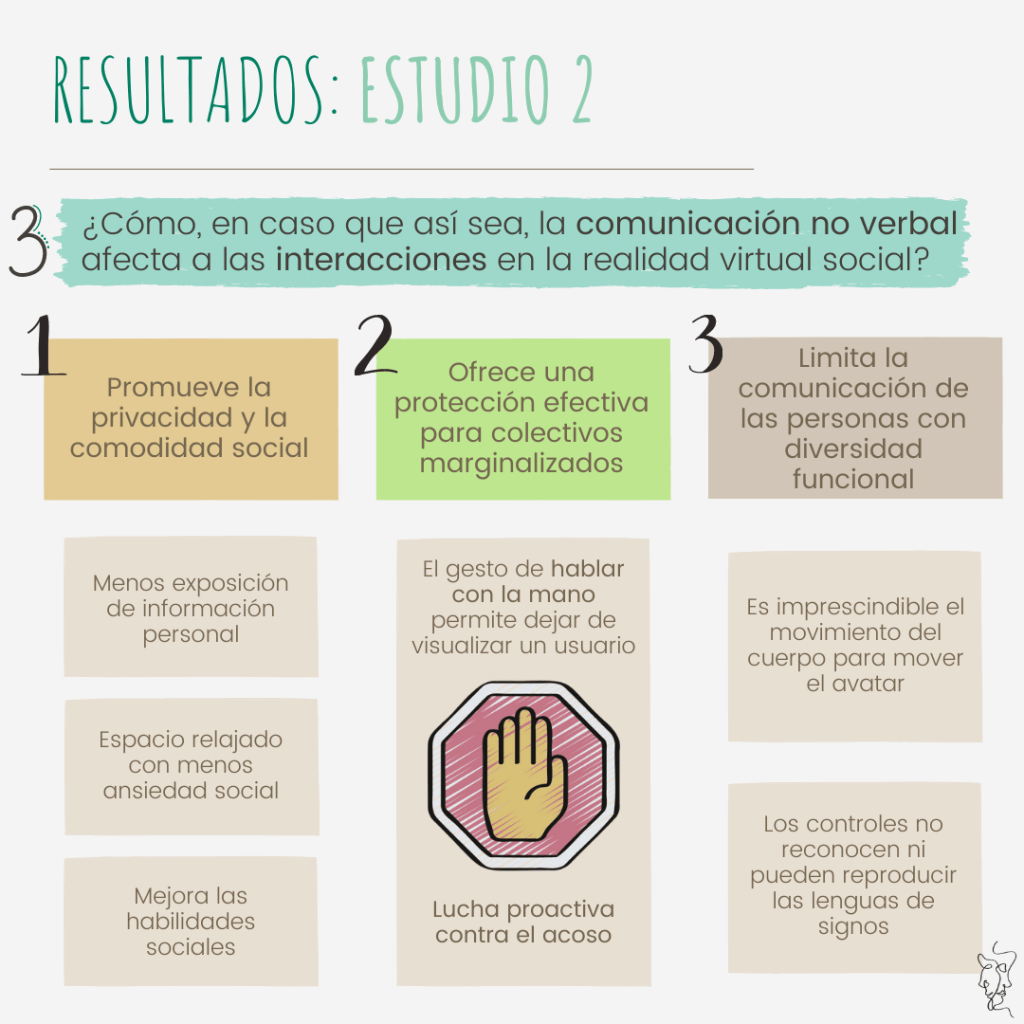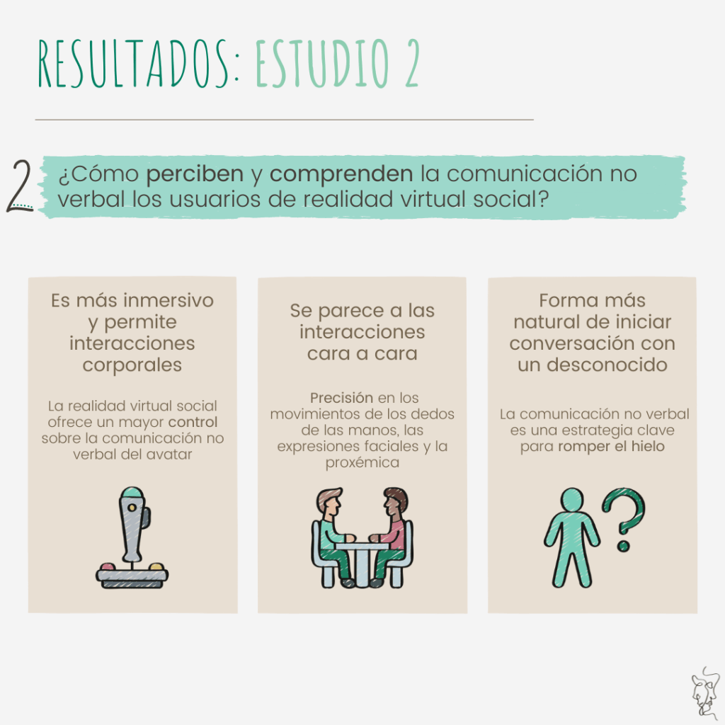 Según los resultados del estudio, la mayoría de las personas entrevistadas opina que la comunicación no verbal en la realidad virtual social es algo positivo para su experiencia. En la realidad virtual social, la comunicación no verbal se desarrolla a través de avatares que simulan completamente el cuerpo y los movimientos del usuario. Esta técnica es una forma novedosa y distinta de expresar los comportamientos no verbales en entornos virtuales.