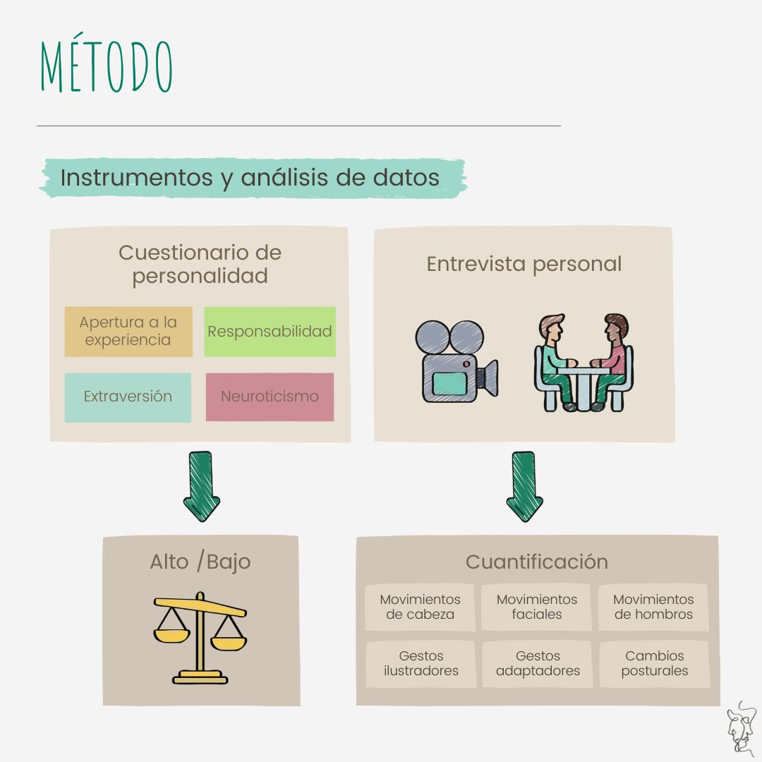 En el estudio, se clasificaron los rasgos de personalidad del cuestionario en niveles altos y bajos, y se contó cuántos gestos realizaron los participante en respuesta a cada una de las preguntas. Recordemos que los gestos incluyeron movimientos de la cabeza, cara y hombros, gestos ilustradores y adaptadores, y cambios de postura.