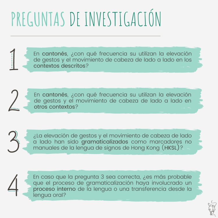 Las preguntas de investigación que presentamos a continuación surgieron de la revisión de la literatura científica descrita en «La gramaticalización de gestos en signos no manuales: Aspectos teóricos (Parte I)».