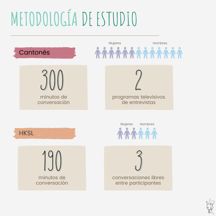 Por otro lado, las conversaciones en HKSL fueron grabadas por el propio equipo de investigación. Se registraron 190 minutos con 6 participantes signantes6 nativos, 3 mujeres y 3 hombres, que conversaron libremente durante aproximadamente una hora.