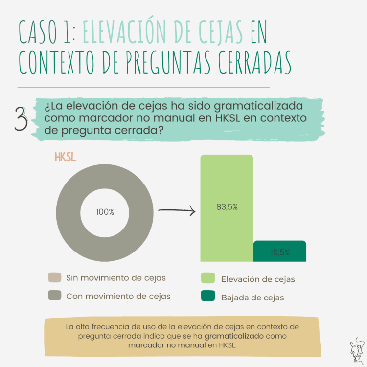 En las conversaciones en HKSL, al hacer una pregunta cerrada, los signantes siempre utilizan un movimiento de cejas. Normalmente, suelen levantar las cejas (83,5%), pero en algunas ocasiones también las bajan (16,5%).