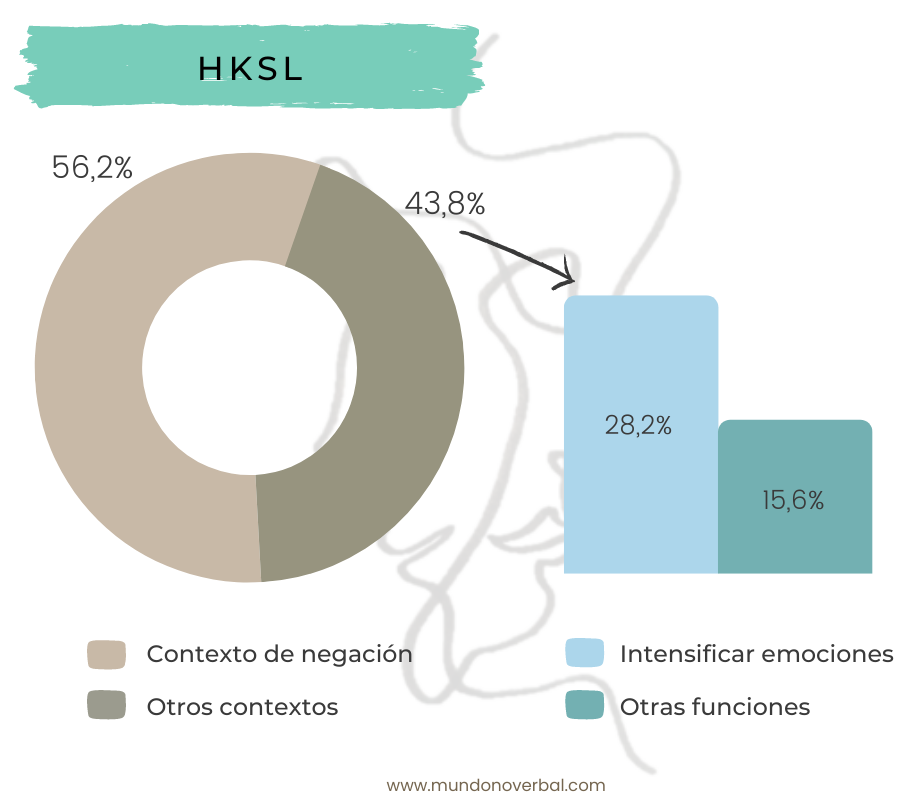 En cambio, en HKSL las funciones del movimiento de la cabeza de lado a lado son más variadas. Su usa principalmente para negación (56,2%), pero también para intensificar emociones (28,2%). Una función que no se da en cantonés.