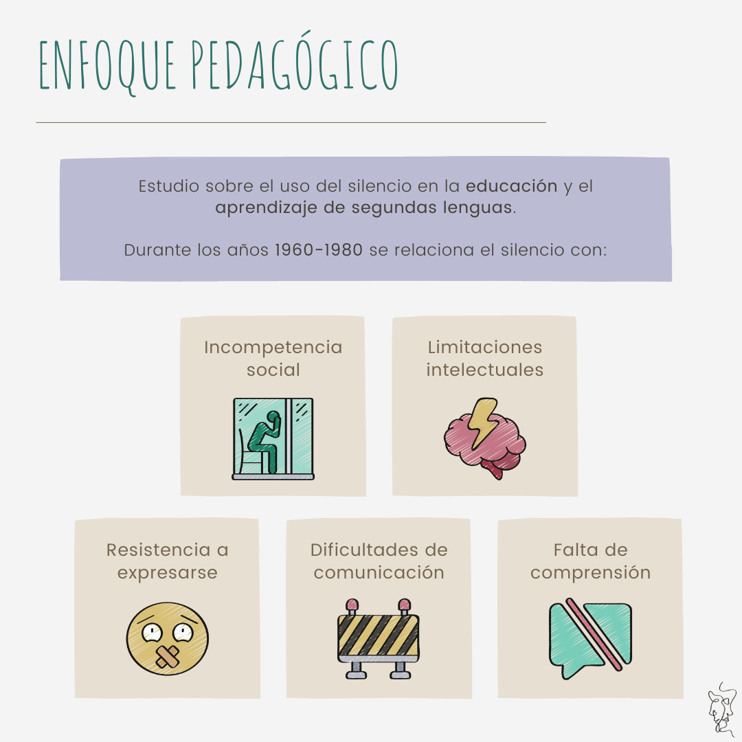 Asimismo, en el aprendizaje de una segunda lengua, hasta finales de 1980 el silencio se veía como una resistencia a hablar, dificultades en la comunicación y falta de comprensión.