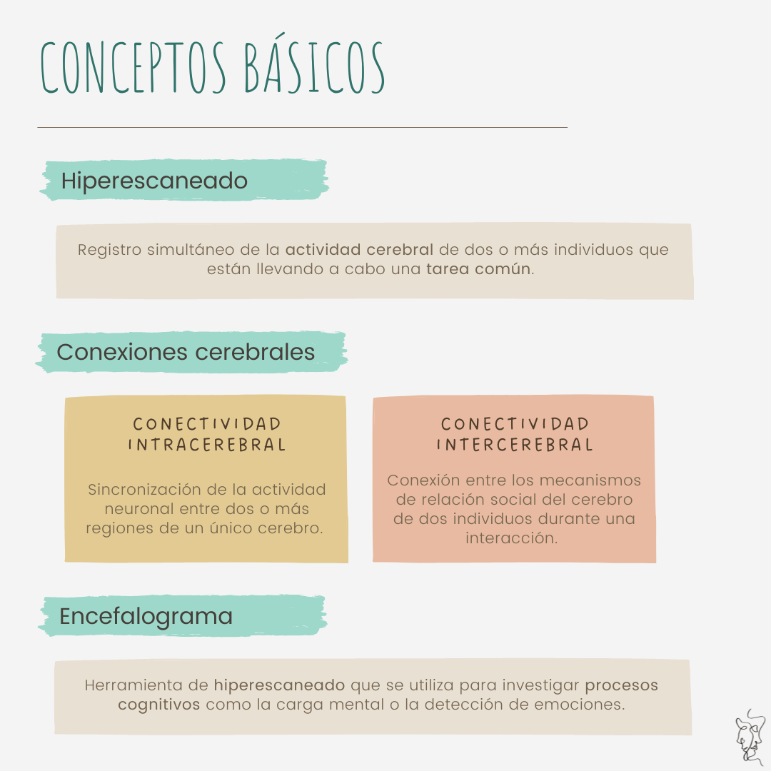 Es importante conocer las diferentes conexiones cerebrales para entender el funcionamiento del hiperescaneado. Por un lado, la conexión intracerebral es la sincronización de la actividad neuronal entre diferentes áreas de un único cerebro. Por otro lado, la conexión intercerebral se refiere a la conexión entre los mecanismos de relación interpersonal2 del cerebro de dos personsas durante una interacción social.