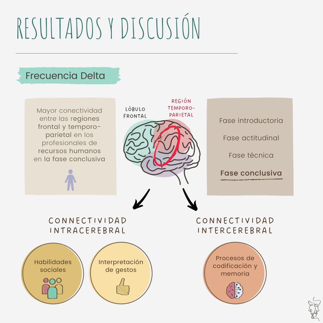 Los datos muestran que los profesionales de recursos humanos tienen una mayor conexión entre las regiones frontal y temporo-parietal del cerebro en la frecuencia delta. Esta conexión puede indicar una sincronización cognitiva y se relaciona con la interpretación de gestos.