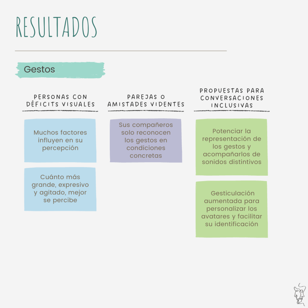 Para ayudar a las personas con déficits visuales a reconocer los gestos, el entorno virtual debería potenciar la representación de los gestos y acompañarlos de sonidos que faciliten su reconocimiento. Además, una gesticulación aumentada también podría utilizarse para personalizar los avatares de los interlocutores y facilitar así su identificación.