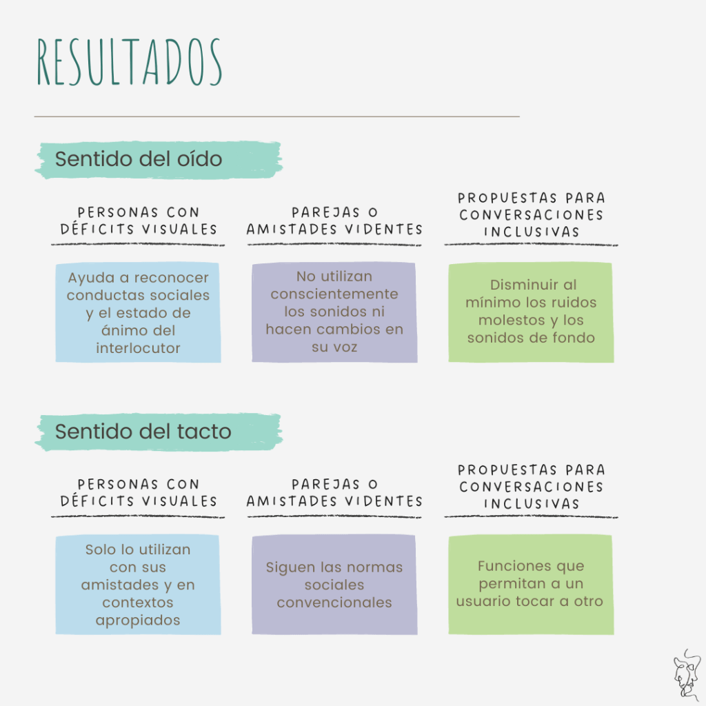 Todos los participantes con déficits visuales afirmaron que están familiarizados con situaciones en las que las personas se comunican sólo a través de la mirada, pero que ellos normalmente prestan atención a otras señales comunicativas complementarias como la risa o el sonido de aclararse la garganta.