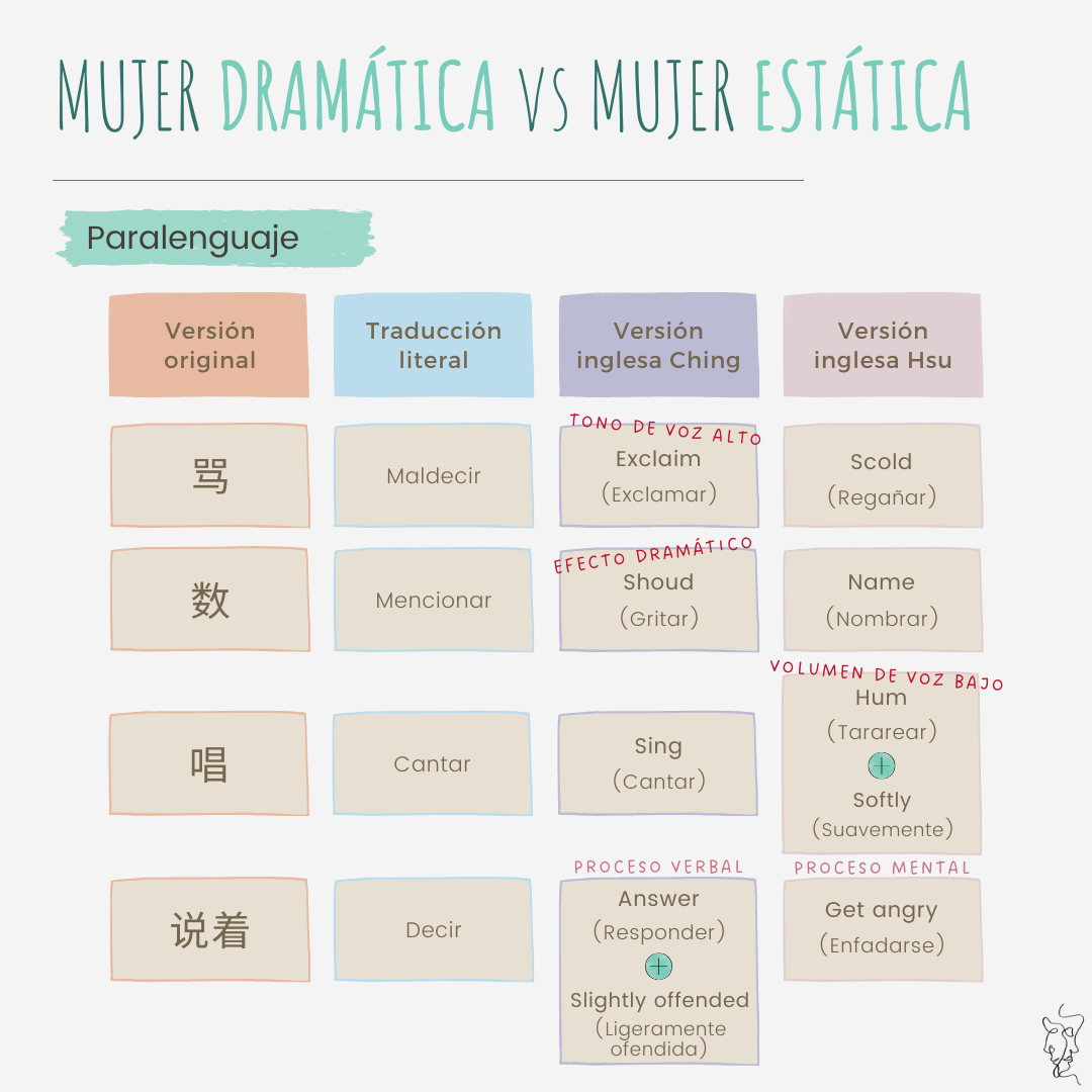 A través de los ejemplos analizados podemos concluir que el personaje de la mujer en la versión de Ching tiene una forma de hablar más estridente y dramática que la versión de Hsu, que es más contenida.
